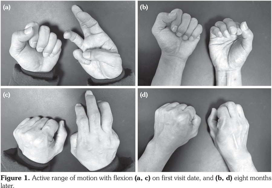 The causes of flexion contractures in this case are thought to be tophi between articular margins and swelling of flexor tendons. Gouty involvement of hands with tenosynovitis and tophi, even more as initial presentations, is unusual.(2-4,6) With the changing pattern of gout and its expanding clinical spectrum, physicians should be aware that gout can occur even if the initial presentation is in the upper extremity.(2,8) Because digital hand contractures without signs of acute inflammation can suggest gout, its evaluation should include a search for tophi or hyperuricemia. When there is unusual presentation of gout, it is necessary to rule out infection, neuropathy, another type of arthritis, and tumors.(5,9) Most importantly, gout may be preferentially managed with medication, even if joint contractures are present.