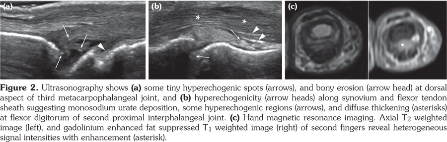 A 51-year old male patient presented with an 18-month history of an inability to flex his right second to fourth fingers. There was no family history of gout. Physical examination showed no mass or erythema in his hands, and no sensory deficits. Passive limitations of motion were present. The active range of motion of the right second to fourth metacarpophalangeal (MCP) joints and that of the right second to fourth proximal interphalangeal (PIP) joints were limited to less than 5° and 30° of flexion, respectively (Figure 1a, c). The neurologist suggested idiopathic focal dystonia as a possible diagnosis with the normal findings of electromyography, nerve conduction velocity, and cervical spine magnetic resonance imaging. The serum uric acid level was elevated at 8.2 mg/dL and estimated glomerular filtration rate by Modification of Diet in Renal Disease was 67 mL/minute. His lipid panel was normal except for triglyceride (365 mg/dL). Plain radiography of his foot and ankle showed no abnormal findings. Ultrasonography revealed synovial hypertrophies at all the MCP, PIP, and distal interphalangeal joints of his right hand with bony erosions and multiple hyper and hypoechogenic regions, representing tophi (Figure 2a). The second to fourth flexor digitorum tendons also showed diffuse thickening with hyperechogenicity along the sheaths (Figure 2b). Magnetic resonance imaging of the right hand revealed multiple areas of synovial and capsular enhancement at all the MCP, PIP, and distal interphalangeal joints, and heterogenous signal intensities with enhancement around all flexor and extensor tendons (Figure 2c). Polarized microscopy of aspirate from a white deposit on his left ear showed many negatively-birefringent, needle-shaped crystals. Febuxostat (40 mg per day), nonsteroidal anti-inflammatory drugs and rehabilitation were started. Eight months later, the serum uric acid level decreased to 5.2 mg/dL. The active range of motion of the right second to fourth MCP joints improved from 5° to 30° of flexion, and that of the PIP joints from 30° to 90° (Figure 1b, d).