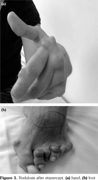 - Cunnane G, Warnock M, Fye KH, Daikh DI. Accelerated nodulosis and vasculitis following etanercept therapy for rheumatoid arthritis. Arthritis Rheum 2002;47:445-9.