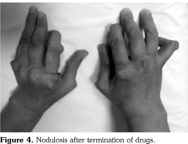 Accelerated nodulosis was first described by Kremer and Lee in 1986 as increased number of nodules in three patients with long-term use of MTX.(6) Since that time, several reports were published indicating that accelerated nodulosis was seen at rates of 8-11% in patients with RA taking MTX.(4) Subcutaneous nodules may develop at a mean of three years after the start of MTX treatment.(7) HLA-DRB1*0401 and RF positivity are related to MTX-induced accelerated nodulosis.(3,8) There have been occasional reports of accelerated nodulosis associated with other disease modifying antirheumatic drugs other than MTX, such as leflunomide, azathioprine and anti- TNF drugs, particularly etanercept.(2,4,5) Newly emerged rheumatoid nodules mainly affect the hands, particularly the metacarpophalangeal and proximal interphalangeal joints. While MTX- induced accelerated nodulosis affects the hands at a rate of 88%, non-accelerated nodulosis affects the hands at a rate of 34%.(3,8,9) Compared to classic rheumatoid nodules, accelerated nodules have more rapid onset and growth, are smaller and follow a different distribution (hand, foot, and ear).(3) Accelerated nodules generally develop while there is low disease activity. Histopathologically, they are not different from rheumatoid nodules. They develop in three zones; internally mononuclear cells surrounding fibrinoid necrosis while externally there is granulomatous inflammation.(6,10) The pathogenesis of drug-related nodulosis is not clear. Increased giant cell formation with A1 receptor stimulation and adenosine production stimulated from the monocytes by MTX could be effective in the pathogenesis and it is theorized that drugs which inhibit adenosine A1 receptor could be useful in MTX-induced accelerated nodulosis.(11) The rheumatoid synovial membrane and rheumatoid nodules are histologically similar. Still, there are some differences. Unlike in the synovium, there are no B cells, plasma cells or organized lymphoid structures in rheumatoid nodules. In addition, E-selectin expression is higher in the blood vessels of rheumatoid nodules than in the synovium. Wikaningrum et al.(12) determined that interleukin-1 beta (IL-1β) was elevated in rheumatoid nodules and not in the synovium. Furthermore, the TNF-alpha (α) level was found to be high in the synovium and low in rheumatoid nodules. Cunnane et al.(2) reported three cases of seropositive arthritis who developed nail bed infarcts and an increased number of nodules two-three months after starting etanercept treatment. It was thought that vasculitis, treatment-related cell death and increased chemotaxis could be responsible in the formation of nodules. Mackley et al.(13) reported a seropositive RA patient who developed nodules on the hands one year after starting infliximab treatment. There is no proven treatment for accelerated rheumatoid nodulosis; therefore, it is wise to stop the offending drug. Various drugs have been attempted for the treatment of accelerated nodulosis,(14) most commonly hydroxychloroquine, colchicine, D-penicillamine, and sulfasalazine.(15-18) Cases of pulmonary nodules were reported that improved with tocilizumab and rituximab.(19,20) Several cases of severe subcutaneous nodulosis treated with rituximab were also reported.(21) In our patient, nodulosis started with the use of MTX first and even increased with further use of etanercept and leflunomide. Contrary to the reports in the literature, after withdrawal from drugs, neither the size nor the number of nodules decreased in our patient. Use of colchicine had a subtle effect and hydroxychloroquine had no effect. The development of nodulosis in our patient during a period of low disease activity was consistent with the literature. The patient being seropositive and having a history of smoking were risk factors for nodulosis, particularly for MTX- induced accelerated nodulosis. HLA-DRB1*0401 positivity was not evaluated in our patient as this evaluation is not available in routine practice at our hospital.