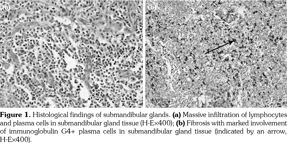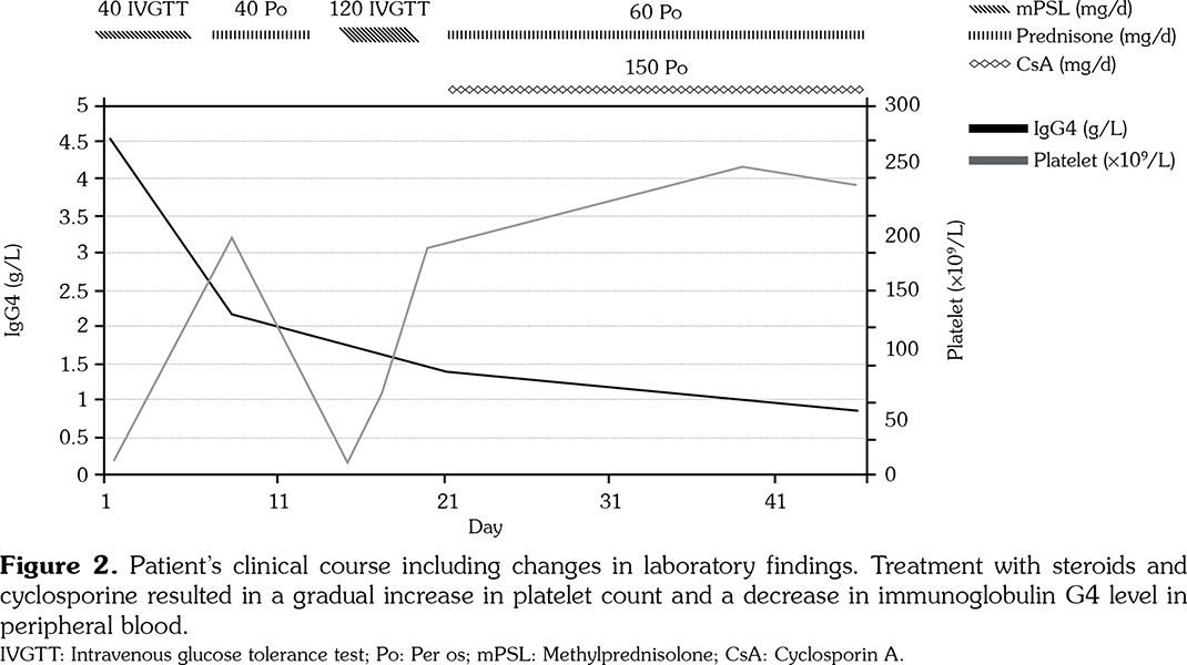 A 48-year-old male patient was admitted to our department with enlarged lacrimal and parotid glands associated with thrombocytopenia. He underwent resection for bilateral swelling of submandibular glands three years ago. The pathological examination revealed no tumor cells or focal lymphocytic infiltration. However, he repeatedly had enlarged lacrimal and parotid glands and dry mouth, without dry eye or arthralgia. He was then diagnosed with Sjögren syndrome (SS) and received anti-rheumatic treatment with hydroxychloroquine and Tripterygium wilfordii (a traditional Chinese medicine having definite effects on autoimmune and inflammatory diseases) for two years. However, the patient suffered from repeated recurrences of enlarged glands and presented with thrombocytopenia after two years. Physical examination revealed nontender bilateral swelling of lacrimal and salivary glands (about 2x1.2 cm2) and of multiple superficial lymph nodes. Laboratory studies showed severe thrombocytopenia (platelet [PLT] 6x109/L, normal range 100-300x109/L), serum IgG4 4.52 g/L (normal range 0.030-2.010 g/L), and negative angiotensin-converting enzyme and autoantibodies. The ophthalmological examination excluded dry eye. No focal lymphocytic infiltration was found in the biopsy of labial glands. Bone marrow cytology and biopsy results were normal. Subsequent positron emission tomography and computed tomography scan images showed abnormal glucose accumulation in several superficial lymph nodes, particularly left axillary lymph nodes (maximum standardized uptake value 11), suggesting a likelihood of lymphoma. The patient then underwent a biopsy of the swollen lymph node in the left armpit region. The pathological examination showed reactive hyperplasia of lymph nodes. Furthermore, the IgG4 immunohistochemical staining of the submandibular gland was performed. As shown in Figure 1, the pathological examination revealed IgG4+ cells >10/high-power field (HPF), and a proportion of IgG4+/IgG+ plasma cells >50%. The final diagnosis was IgG4-related MD with immune thrombocytopenia. The patient was given intravenous 40 mg methylprednisolone for seven days. The swelling of glands reduced, and the PLT count recovered to the normal level (193x109/L). The patient was treated with 40 mg oral prednisone for seven days. Unexpectedly, he had repeated recurrences of the swelling of glands with severe thrombocytopenia (10x109/L). Then, the patient received 120 mg methylprednisolone for five days. The swelling of glands narrowed again, and the PLT count slowly increased (56x109/L). The patient was given 60 mg prednisone and 150 mg cyclosporine. The swollen glands reduced to normal size, and the serum IgG4 level and PLT count returned to normal level in 1.5 months (Figure 2). A written informed consent was obtained from the patient according to the institutional guidelines.