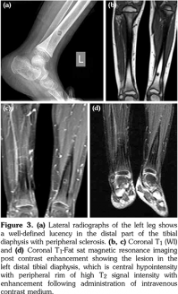 He was started on non-steroidal antiinflammatory drugs (NSAIDs), naproxen, and elemental iron. His fever and joint pain subsided after two weeks. However, two weeks later, he started complaining of pain in the lower end of the left tibia. Three-phase bone scan showed increased tracer uptake in the distal metaphysis of the left tibia in all phases, including flow phase, blood pool, and delayed phase (Figure 2). Plain X-ray of the left leg revealed a well-defined lucency in the distal part of tibial diaphysis with peripheral sclerosis (Figure 3a). Magnetic resonance imaging (MRI) of the left leg revealed a lesion in the left distal tibia diaphysis, which appeared as a central hypointensity with a peripheral rim of signal intensity, with enhancement following administration of intravenous contrast medium (Figure 3b-d). Open bone biopsy of the lower end of the left tibia revealed viable compact bony trabeculae with fibrosis and congestion in the marrow spaces. Features were of periosteal proliferation and were consistent with chronic osteomyelitis (Figure 4). Bone aspirate culture was negative.