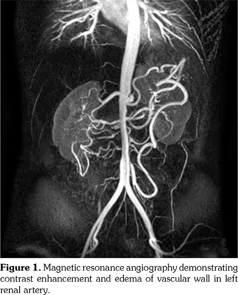 Case 3- A 33-year-old female patient was diagnosed of TA in 2013 with complaints of malaise, anorexia, systolic blood pressure difference, high ESR (120 mm/hour) and CRP (79 mg/L), and type V angiographic involvement. MTX and 1 mg/kg MP were prescribed at the beginning of treatment. Because of gastric intolerance, MTX was changed to LEF. We tapered MP dose gradually. With 15 mg/day dose of MP, we observed elevation of ESR (80/hour) and CRP (58 mg/L) with complaints of weakness, malaise, and fever. On control MR angiography, a new finding, narrowing of left renal artery that involved 8.5 cm segment with contrast enhancement and edema of vascular wall, was observed. Patient had plans of conception. So, LEF was discontinued and cholestyramine wash-out procedure was initiated and control LEF level was studied. Due to the progression of disease and wish for pregnancy, CZP was initiated. She was treated with CZP for 12 months and MP dose was tapered to 5 mg/day. At one year of CZP treatment, she was still in laboratory (ESR: 26 mm/hour, CRP: 3 mg/L) and clinical remission (no onset of hypertension or no constitutional symptom). Although there was no further narrowing of left renal artery, contrast enhancement and edema of vascular wall that involved 8.5 cm segment in left renal artery were re-observed on control MR angiography (Figure 1). Because of clinical and laboratory remission with good physician’s and patient’s global assessment, CZP treatment was continued.