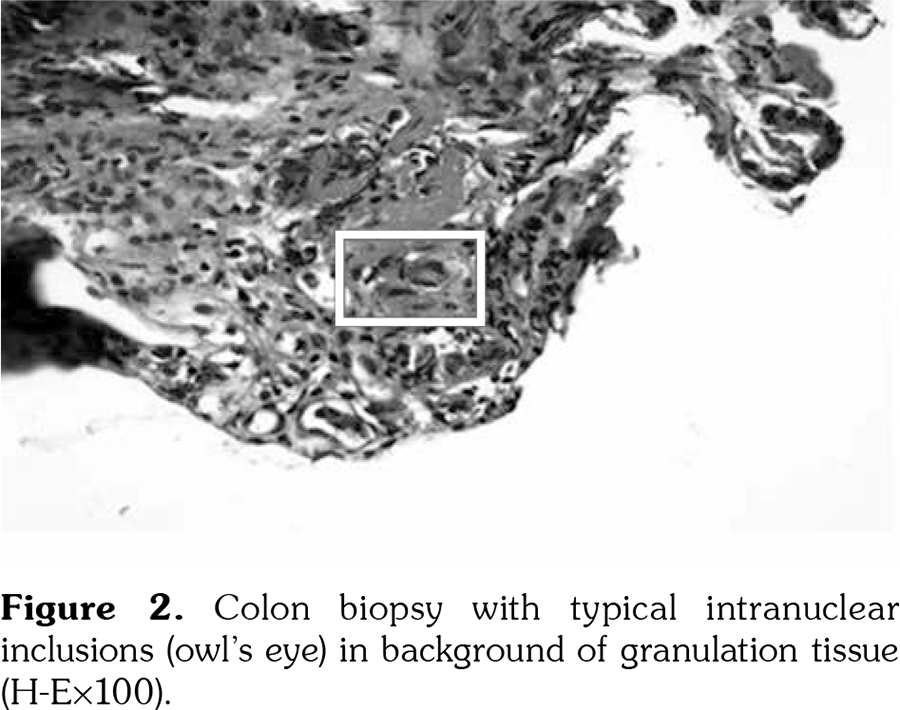 On the third day of hospitalization, colonoscopy was performed due to new bloody diarrhea and showed an ulcer of 20x20 mm in diameter at ileocecal valve. Histological examination of the biopsy specimen identified large intranuclear inclusion bodies on the background of granulation tissue suggesting CMV infection, without features of the vasculitis (Figure 2). Serological testing and polymerase chain reaction (PCR) assay revealed positive CMV immunoglobulin M (IgM) and IgG antibodies and CMV deoxyribonucleic acid (DNA) 34,000 copies/mL. Mycophenolate mofetil was stopped and intravenous ganciclovir was given until CMV DNA was negative in the PCR test for two weeks. After clinical recovery, mycophenolate mofetil treatment was resumed.
