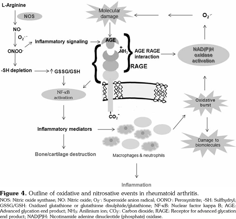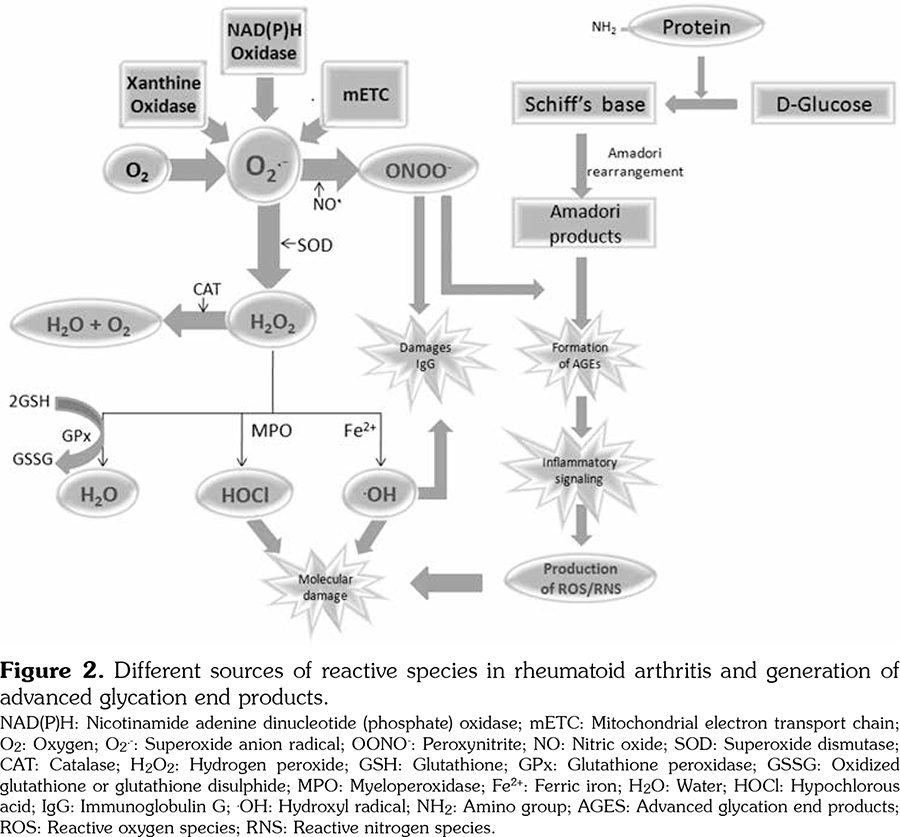 Many studies propose the implications of oxidative and nitrosative stress and production of reactive dicarbonyl species (which ultimately form advanced glycation end products) in the pathogenesis of RA. Oxidative stress is a state in which the dynamic redox balance between oxidants and antioxidants is strongly switched towards oxidative potential leading to interruption of redox signaling and control and/or molecular damage.[10] A parallel process is nitrosative stress which can be defined as the ratio of nitrosants to antioxidants as >1 with the participation of reactive nitrogen species (RNS).[11] Similarly, advanced glycation end products (AGEs) formation and action is another parallel process linked to oxidative and/or nitrosative stress and inflammation.[12]