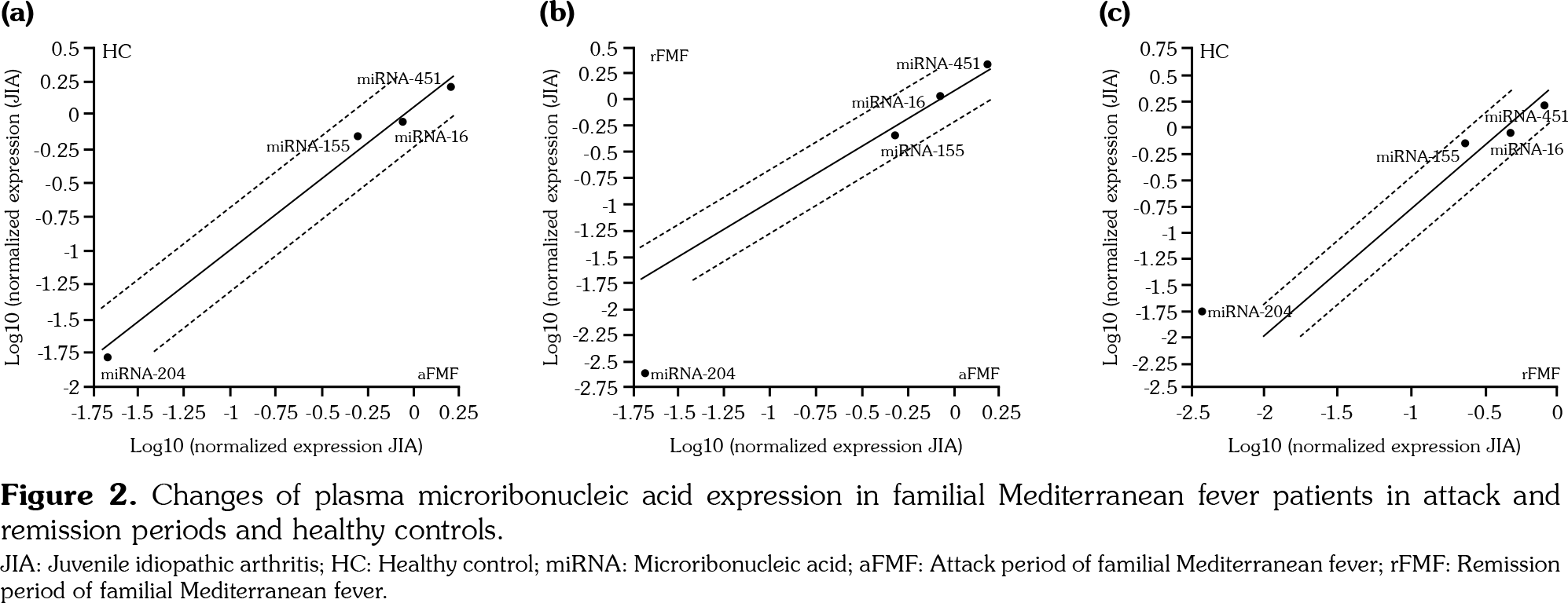 Patients and methods: Thirty patients with FMF (18 males, 12 females; mean age 9.1±4.7 years; range, 3 to 15.5 years) and 30 age- and sex-matched healthy children (18 males, 12 females; mean age 9.5±4.6 years; range, 4 to 16.5 years) were included in this study. The plasma levels of four candidate miRNAs (miRNA-16, miRNA-155, miRNA-204 and miRNA-451) were measured in all subjects. The plasma levels of miRNAs were analyzed with real- time polymerase chain reaction in attack and remission periods of patients and healthy controls (HCs).