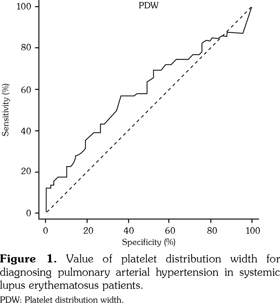 Results: The PDW level was higher in the SLE-PAH group than that in the SLE-non-PAH group (p=0.023). SLE patients were allocated into high systemic lupus erythematosus disease activity index (SLEDAI) group (SLEDAI score, ≥10) (n=121) or low SLEDAI group (SLEDAI score, <10) (n=113). The PDW level was significantly higher in the high SLEDAI group than that in the low SLEDAI group (p=0.030). The receiver operating characteristic curve was used to evaluate the clinical value of the PDW level in diagnosing PAH in SLE patients. The PDW level was valuable for diagnosing PAH in SLE patients [area under the curve (AUC)=0.591, p=0.023]. The optimal critical value of the PDW level was 14.55 fL. Under these conditions, the sensitivity, specificity, and Youden index were 57%, 63% and 0.20, respectively. For newly diagnosed patients, the PDW level had good diagnostic accuracy, with an AUC of 0.626 (p=0.037). The optimal critical value of the PDW level was 14.65 fL. Under these conditions, the sensitivity, specificity, and Youden index were 66%, 67% and 0.33, respectively.