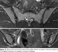 Conclusion: Sacroiliitis was detected more frequently by MRI compared to conventional radiographic examination. MRI is suggested to be the preferred method for evaluating sacroiliitis in SSc patients.