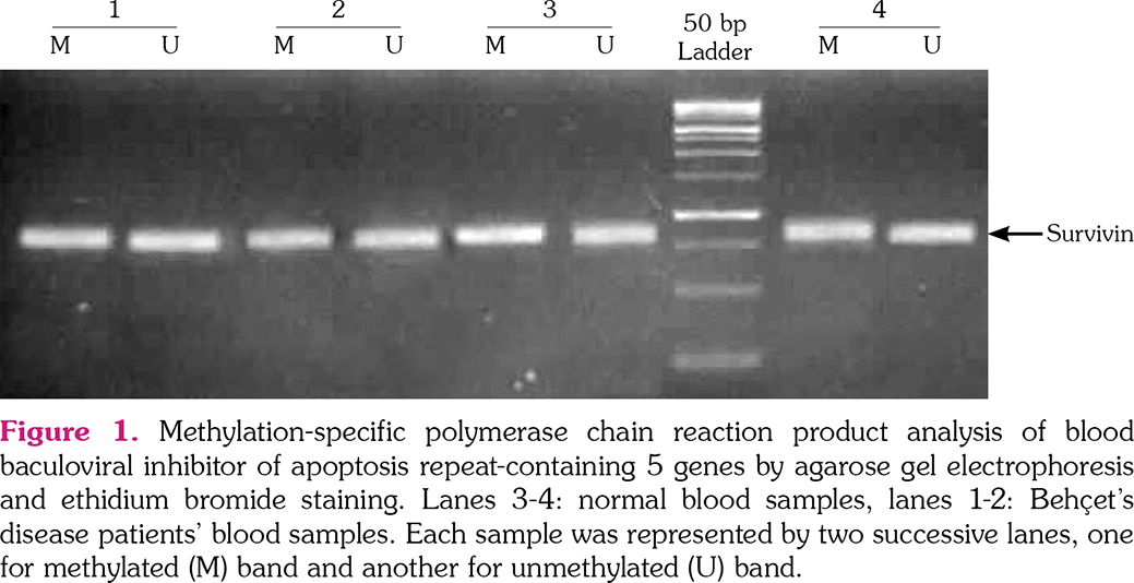 Results: Oral aphthous ulcer, genital ulcer, and skin lesions were the most common clinical manifestations in BD group. MS-PCR showed that the deoxyribonucleic acid samples of BD and control groups were not different in methylated and unmethylated areas and alleles were heterozygote. No significant difference was observed in the plasma levels of survivin in BD (98.86±25.5 pg/mL) and control (118.16±37.4 pg/mL) groups. There was no significant correlation between survivin plasma levels and BD activity.