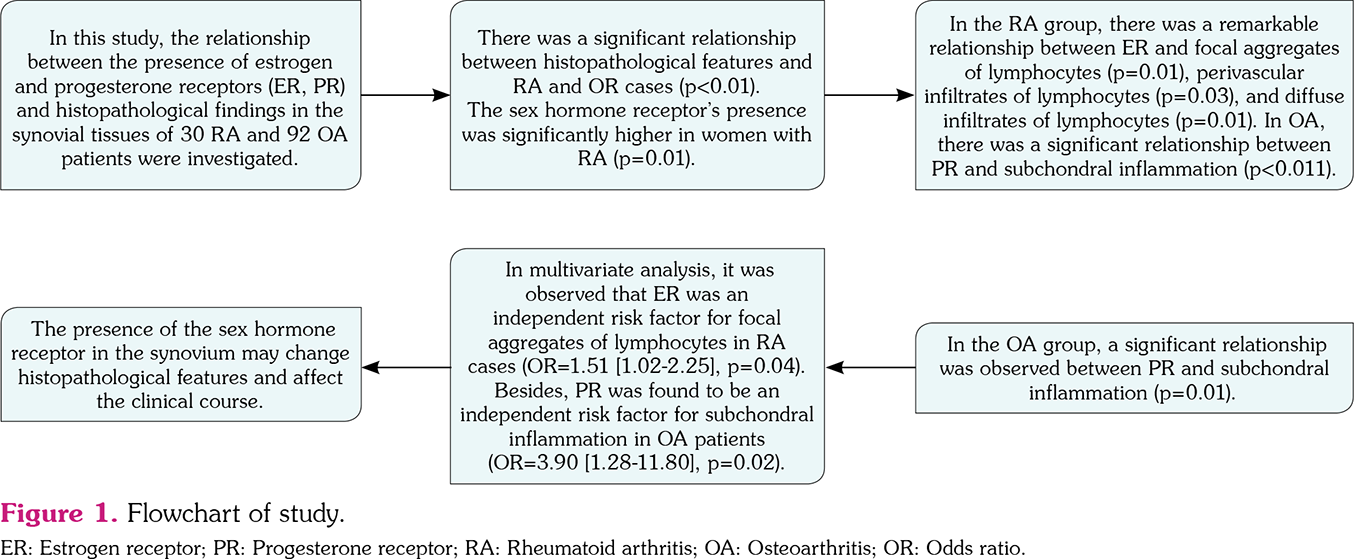 Results: There was a meaningful relationship between histopathological parameters and RA and OA (p=0.01). The sex hormone receptor's presence was significantly higher in females with RA (p=0.01). Additionally, in the RA group, there was a remarkable relationship between ER and focal aggregates of lymphocytes (p=0.01), perivascular infiltrates of lymphocytes (p=0.03), and diffuse infiltrates of lymphocytes (p=0.01). In the OA group, a significant relationship was observed between PR and subchondral inflammation (p=0.01). In multivariate analysis, it was observed that ER was an independent risk factor for focal aggregates of lymphocytes in RA group (odds ratio [OR]=1.51 [1.02-2.25], p=0.04). Besides, PR was found to be an independent risk factor for subchondral inflammation in OA group (OR=3.90 [1.28-11.80], p=0.02).