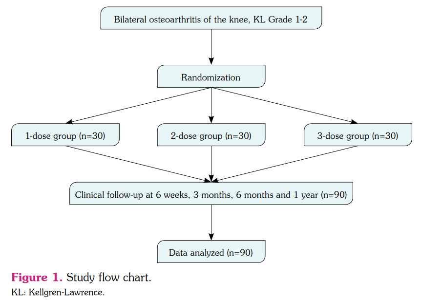 Patients and methods: This single-blind, randomized, superiority trial included a total of 180 knees of 90 patients (22 males, 68 females; mean age: 47.9 years; range, 36 to 60 years) with bilateral OA knee of Kellgren-Lawrence Grade 1-2 between May 2017 and December 2018. The patients were randomized (30 in each group) to receive single, double, or triple doses of IA PRP (two weeks apart in repeat injections). The outcome measures were Visual Analog Scale, International Knee Documentation Committee Score, Knee Injury and Osteoarthritis Outcome Score, and Tegner Lysholm Knee Score. The assessor of outcome was blinded. The scores were collected before intervention and at six weeks, three months, six months, and one year after the intervention.