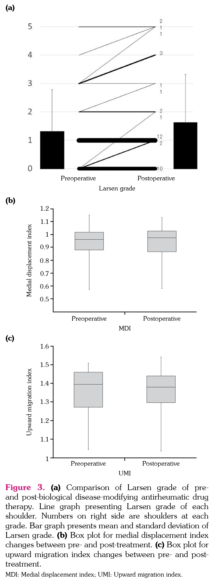 Conclusion: Medial displacement index and UMI correlated with the Larsen grade of the shoulder joint strongly and moderately, respectively. This study suggests that MDI and UMI may help to evaluate radiographic progression of damage in shoulder joints in patients on bDMARDs, which is difficult to detect using the Larsen grade.