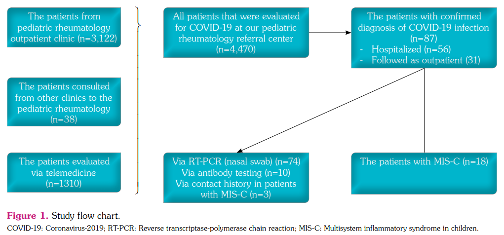 Patients and methods: A total of 87 patients (50 males, 37 females; median age: 12 years; range, 6.6 to 16 years) suspected of having COVID-19 at our pediatric rheumatology clinic between March 11th and October 15th 2020 were retrospectively analyzed. Demographic and clinical features, treatments, laboratory results, imaging findings, and clinical outcomes of the patients diagnosed with COVID-19 and/or multisystem inflammatory syndrome in children (MIS-C) were retrieved from the medical records. The diagnosis of SARS-CoV-2 infection was made based on the reverse transcriptase-polymerase chain reaction test.