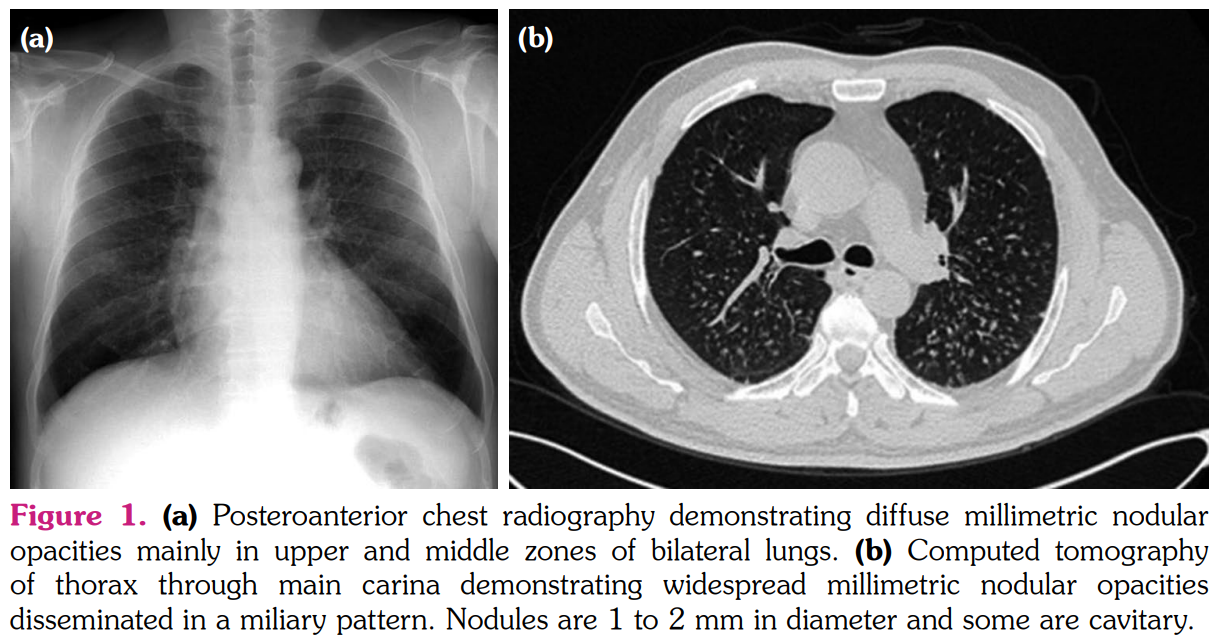 At the end of four years, chest radiography demonstrated diffuse millimetric nodular opacities mainly in upper and middle zones of bilateral lungs (Figure 1a). Computed tomography (CT) of thorax revealed widespread millimetric nodular opacities disseminated in a miliary pattern on bilateral lungs in the absence of hilar or mediastinal lymphadenopathy. The nodules were 1 to 2 mm in diameter and some of them were cavitary (Figure 1b). The patient was free of any symptom and routine laboratory analysis was normal. Pulmonary function tests were within normal limits. A written informed consent was obtained from the patient.