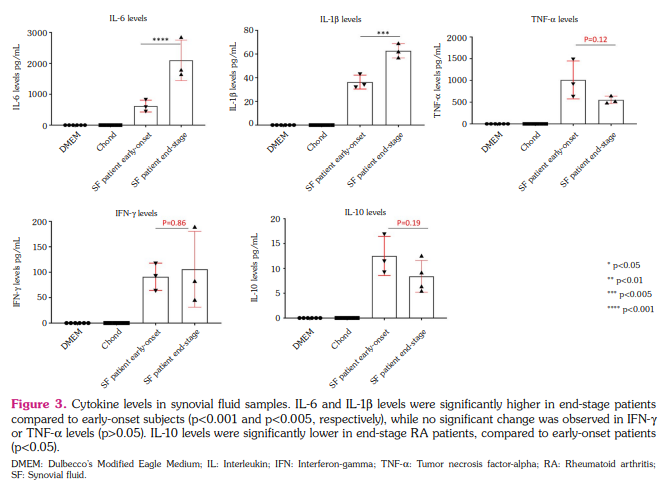 Results: The high levels of IL-1b and IL-6 were observed in end-stage RA patients’ SF samples compared to the early-onset patients (p<0.05). The CD49e and CD49f expressions in DFSCs were significantly higher in the SF samples of end-stage RA patients (p<0.05). Also, the Col II, Sox-9 and Aggrecan messenger ribonucleic acid (mRNA) expressions increased in the DFSCs, when cultured with end-stage RA patients’ SF samples (p<0.01). Collagen-II expression in histochemical analysis of micromass pellets was higher in the DFSCs cultured with end-stage RA patients’ SF samples. The neutralization of IL-6 significantly decreased the CD49e and CD49f expressions (p<0.05).