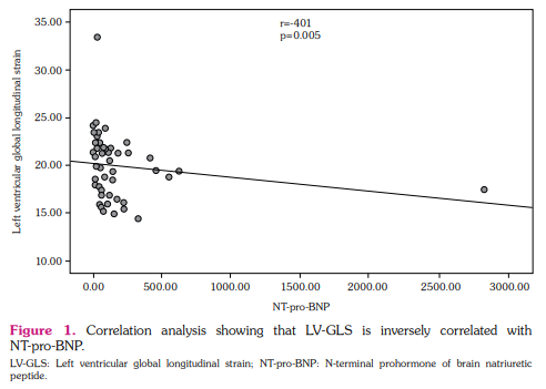 Results: The LV-GLS was lower in AAV patients (19.3% vs. 21.7%, respectively; p=0.014). NT-pro-BNP was negatively correlated with LV-GLS (p=0.005, r=0.401).