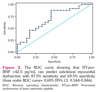 Statistical analysis was performed using the SPSS version 15.1 software (SPSS Inc., Chicago, IL, USA). Continuous variables were expressed in median and interquartile range (IQR), while categorical variables were expressed in number and frequency. The KolmogorovSmirnov or Shapiro-Wilk test was performed to determine whether continuous variables distributed normally. The chi-square test and Fisher exact were used to compare categorical variables. Continuous variables were compared using the Mann-Whitney U test. The receiver operating characteristic (ROC) curve analysis was performed to determine the cut-off value of the NT-pro-BNP with specificity and sensitivity that predicted subclinical left ventricular dysfunction. The Spearman correlation analysis was used to determine the correlation between LV-GLS and NT-pro-BNP. A p value of <0.05 was considered statistically significant.