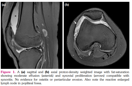 An 18-year-old woman with a history of allergic rhinitis and atopic dermatitis, presented for her pruritic lesions. The pruritic nodules started from the lumbar area nine years ago and subsequently spread to entire body. Topical corticosteroids, oral antihistamines, systemic corticosteroids, and methotrexate were prescribed with no long-term benefits. Dermatological examination revealed hyperkeratotic plaques involving the trunk and extremities. Histopathological evaluation of the lesions was compatible with the diagnosis of prurigo nodularis. She was started on oral cyclosporine 200 mg for seven months; however, within the last month of cyclosporine treatment, her complaints increased, leading us to switch to dupilumab. Although her clinical manifestations and pruritus improved, she developed mild right knee swelling, warmness, and arthralgia after the first maintenance dose following the loading dose. Upon questioning, we recognized that the patient developed reactive arthritis in the right knee, when she was 10 years old. Until now, she stayed asymptomatic. She was consulted to rheumatology department and effusion was detected by right knee ultrasonography and arthrocentesis was performed which revealed no bacterial growth. Elevated C-reactive protein and erythrocyte sedimentation levels were noted. Rheumatological markers were all negative. Right knee magnetic resonance imaging showed moderate effusion along with synovial proliferation consistent with synovitis; no periarticular erosion, osteitis or ligamentous anomaly were detected (Figure 1). She was diagnosed with dupilumab-induced exacerbation of inflammatory arthritis and was started on oral diclofenac and intraarticular steroid injection which resulted in symptomatic relief. Therefore, dupilumab treatment was continued.