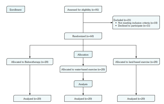 This single-center, prospective, randomized study was conducted at Afyonkarahisar Health Sciences University, Department of Physical Medicine and Rehabilitation between January 2019 and January 2020. A total of 60 patients (35 males, 25 females; mean age: 40.9±11.2 years; range, 18 to 55 years) who were followed in our clinic were included (Figure 1). Inclusion criteria were as follows: having a diagnosis of AS according to the modified New York diagnostic criteria and sedentariness (no physical activity for at least three days a week within the last three months). Exclusion criteria included the presence of any of the following: any orthopedic, neurological, or mental illness that may interfere with exercise; use of an assistive device for ambulation; orthopedic joint prosthesis; total spinal ankylosis; lesions that disrupt skin integrity; uncontrolled cardiopulmonary disease (such as hypertension, chronic obstructive pulmonary disease, heart failure); pregnancy; history of malignancy or recent surgical procedure; regular balneotherapy within the previous three months, and active peripheral arthritis. The patients continued their regular medication with no dosage changes, and no new medications were initiated during the study period.
