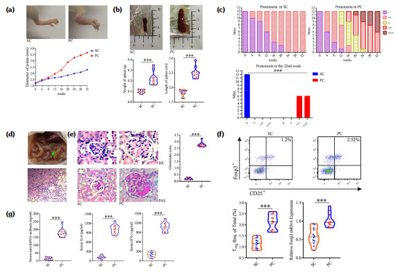 Red swollen joints and proteinuria were first observed in PC after the 12th week. Thus, the model of murine lupus was successfully established (Figure 1).
