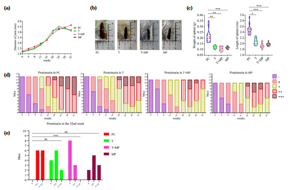 Body weight and leg joint diameter were measured every four weeks. At the end of the 32nd week, the mice were sacrificed, and their spleen and kidney size and weight were measured.