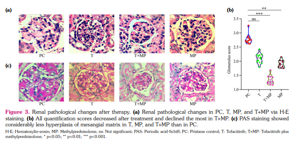 Tofacitinib delayed the nephritic physiological progression of lupus mice. Diffuse proliferation, glomerular balloon adhesion, and solitary or multiple glomeruloscleroses were found in PC. After therapy, moderate multifocal hyperplasia, mild hyperplasia, or occasionally normal conditions were observed in T and MP with few glomeruli demonstrating diffuse proliferation, glomerular balloon adhesion, and no visible focal sclerosis. In T+MP, a small amount of normal glomeruli, less diffuse proliferation, less balloon adhesion, moderate multifocal hyperplasia, and mild focal hyperplasia were observed without focal segmental sclerosis (Figure 3a). All renal pathological scores decreased after treatment, with the greatest decline observed in T+MP, thereby indicating that the best curative effect was achieved (Figure 3b).