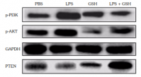 To investigate the mechanism via which GSH inhibits the production of pro-inflammatory cytokines, Western blot analysis was performed to test whether GSH regulated the PTEN/PI3K/AKT signaling pathway. Regulation of PI3K/AKT pathway is usually reflected by phosphorylation of PI3K. Thus, this study detected phosphorylation of PI3K (p-PI3K) and p-AKT protein only via Western blot. The results demonstrated that, compared to the LPS group, the expression of PTEN was enhanced, while the p-PI3K and p-AKT was significantly downregulated in the LPS+GSH group (Figure 5). These results indicated that, in MH7A cells, GSH significantly suppressed the PI3K/AKT pathway, as well as the increased PTEN expression.