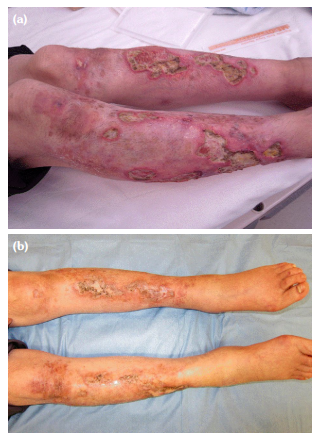 A 61-year-old woman developed a malar rash, arthritis, and nephrotic syndrome 40 years ago. At that time, although renal biopsy was not performed, she was positive for anti- double-stranded deoxyribonucleic acid (anti- dsDNA) antibodies and anti-nuclear antibodies (ANA) and, therefore, she was eventually diagnosed with systemic lupus erythematosus (SLE). She was treated with 80 mg/day of prednisolone monotherapy. As SLE became less active, the dosage of prednisolone was tapered to 12.5 mg every other day. When the patient reached 59-year-old, she developed atrophic and scaly erythema on her lower legs, and she was clinically diagnosed with discoid lupus erythematosus (DLE). Two years later, scaly erythema eventually progressed to severe ulcerations (Figure 1a). Aside from these, there were no other significant physical findings. The patient did not have cytopenia or hypocomplementemia. C-reactive protein and urinalysis results were also normal. At this point, she was negative for ANA, anti-dsDNA antibodies, and any other antibody profiles, including anti-scleroderma-70 and anti-phospholipid antibodies. Based on a published article of lupus erythematosus profundus (LEP) in patients with DLE1 and the fact that this condition led to cutaneous atrophy and ulceration, a diagnosis of LEP with severe ulceration was made. Therefore, the patient received prednisolone at a dose of 40 mg/day and tacrolimus at a dose of 3 mg/day. However, the ulcers were refractory to treatment, despite treatment adherence for two months. Accordingly, we added etanercept at a dose of 50 mg/week. One week after the first subcutaneous injection of etanercept, ulcerations showed onset of granulation and epithelialization. After two months, ulcerations completely epithelialized leaving behind an atrophic scar (Figure 1b). At this point, we tapered the dose of prednisolone to 5 mg, while continuing etanercept. For almost two years now, the recurrence of LEP and DLE has not occurred. Moreover, the patient has no infections currently. A written informed consent was obtained from the patient for the publication of this case sreport.