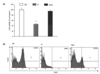 To determine the antioxidant effects of GSPE on RA-FLSs, the ROS inhibitor NAC was used for the positive control group to observe changes in the number of surviving cells. As a result of co-treating RA-FLSs with GSPE (200 μg/mL) and NAC (10 mM), the cells showed reduced cell viability when treated with GSPE, but exhibited no changes in cell viability when treated with NAC compared to the control group (Figure 4a, f=122.20, p<0.001). This result indicated that NAC did not show cytotoxicity in RA-FLSs. When RA-FLSs were treated with GSPE (100 μg/mL) and NAC (10 mM) for 8 h and analyzed using flow cytometry to examine changes in the amount of ROS, we found that ROS reduced 1.7-fold more than the control group in the case of NAC treatment and 53 times more than the control group in case of GSPE treatment (Figure 4b). This outcome suggested that GSPE reduced the generation of ROS in RA-FLSs to a greater extent than NAC.
