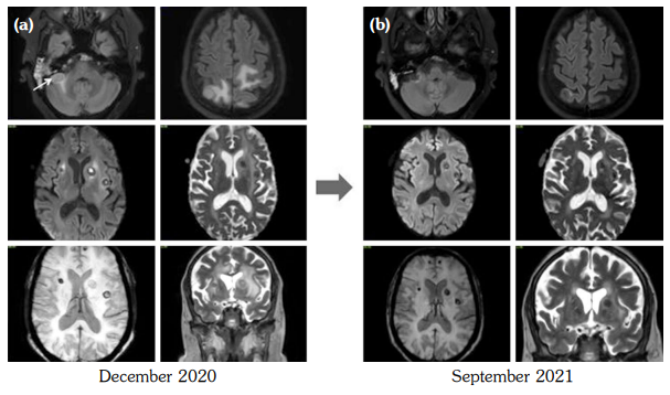 A 60-year-old female patient presented with subacute ataxic-hemiparesis progressing over two months. In the past, she was diagnosed with end-stage renal disease, with anti PR3 antibodies, and was receiving maintenance hemodialysis for 2.5 years. One year earlier, she presented with a mass in the right breast; histopathology had demonstrated non-caseating granulomas with no evidence of mycobacterial or fungal infection, and had responded to oral corticosteroids. On admission, magnetic resonance imaging (MRI) (Figure 1) showed multiple supra- and infratentorial brain lesions with perilesional edema (Figure 1a). Most lesions revealed a ‘target appearance’ on T2-weighted images with peripheral iso/hypointense rims surrounding the hyperintense central area. These were diffusion restricted centrally, and blooming in lesion wall on susceptibility images, all suggesting intracranial granulomas. Toxoplasma and tuberculosis serology (IGRA) were negative, but anti PR3-ANCA levels (EIA) were raised. The patient refused an invasive biopsy. The granulomas were considered a part of the granulomatosis with polyangiitis (GPA) and an oral steroid trial showed a marked improvement in the ataxia and weakness. Rituximab was administered. Control MRI documented reduction in size and perilesional edema (Figure 1b). Intracranial manifestations of GPA, apart from those attributed to vasculitis, are granulomas that are usually contiguous with extracranial sites such as sinuses or the mastoid.[1] This patient had unusual remote granulomatous disease in two distinct organs: the breast and brain.