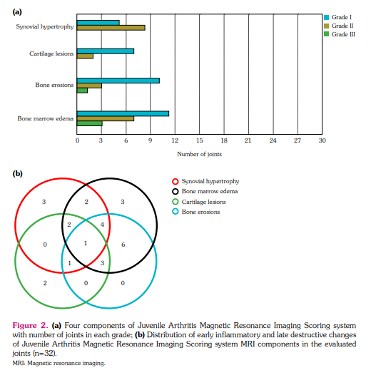 The Juvenile Arthritis Disease Activity Score for 27 joints (JADAS-27) was determined for disease activity assessment (range 0-57). The disease status at the time of analysis was evaluated using the Wallace criteria for clinical remission that included active and inactive disease and were compared with MRI findings.[14]