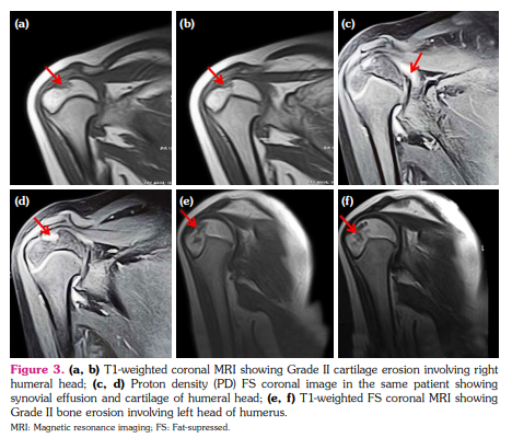 The JAMRIS system described by Hemke et al.,[4] for MRI evaluation of knee joints were used in our study for shoulder joint evaluation. The four components of MRI scoring included two early changes and two late destructive changes of joint inflammation. The two early inflammatory MRI changes were synovial hypertrophy (measured as maximal synovial thickness) and BME (measured as percentage involvement of bone volume). Grades of synovial hypertrophy were Grade 0: 0-2 mm; Grade I: ≥2-4 mm; Grade II: >4 mm and grades of BME were Grade 0: none; Grade I :< 10%; Grade II: ≥10-25%; Grade III: ≥25% involvement of bone volume. The two late destructive MRI findings were cartilage lesions (measured as percentage involvement of cartilage surface area) and bone erosions (percentage involvement of bones at the articular end). Cartilage lesions were graded using a scale of 0-3 (Grade 0: None, Grade I: <10%, Grade II: ≥10-25%, Grade III: ≥25%) and bone erosions were graded between 0-3 (Grade 0: none; Grade I: <10%; Grade II: ≥10-25%, and Grade III: ≥25%).