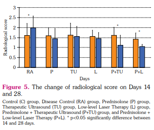 In conclusion, thermal imaging and radiographic examination can give results consistent with the severity of the disease. However, thermal imaging can be ineffective for follow-up thermal application. Although either LLLT or TU have positive effects on RA, a more effective result obtained from the use of LLLT and TU combination with intra-articular P. Also, LLLT and TU may become a better therapeutic opportunity for the treatment of RA. However, further studies are needed to investigate the effects of using various doses of LLLT and TU in rat models of RA.