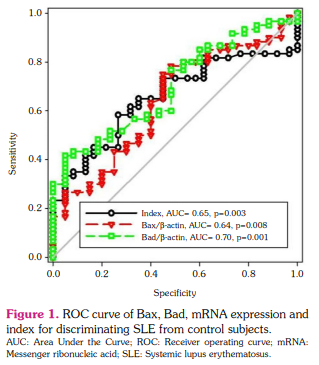Results: The expression of Bax and Bad was significantly lower in SLE group than the control group. The median value of mRNA expression of Bax and Bad was 0.72 and 0.84, respectively versus 0.76 and 0.89 in the control group. The median value of (Bax*Bad)/β-actin index was 17.8 in the SLE group and 19.64 in the control group. The expression of both Bax, Bad and (Bax*Bad)/β-actin index had a good significant diagnostic utility (area under the curve [AUC]= 0.64, 0.70, and 0.65, respectively). The Bax mRNA expression showed a significant upregulation with disease flare-up. The efficacy of Bax mRNA expression in predicting SLE flare-up was good (AUC= 73%). In the regression model, the probability of flare-up reached 100%, with increasing Bax/β-actin as well, and the likelihood of flare-up increased 10,314 times with every unit increase of Bax/β-actin mRNA expression.