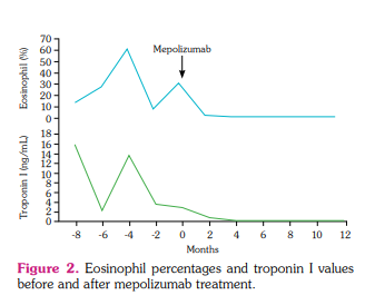 A 17-year-old female patient was admitted with complaints of a rash on the feet, a lesion on the palate, and cough. Her medical records showed that she used inhaler and systemic corticosteroid treatment with the diagnosis of asthma and allergic pulmonary aspergillosis for two years. Physical examination revealed a 1 cm2 ulcerated lesion on the upper palate, petechial rash on bilateral feet, and expiratory rhonchus in lung auscultation. Complete blood count showed eosinophilia (white blood cell count: 10.7x103/μL, eosinophil count: 1.5x103/μL). Acute phase reactants and troponin I levels were elevated [C-reactive protein: 17 mg/L (normal <5 mg/L), erythrocyte sedimentation rate: 44 mm/h (normal <20 mm/h), troponin I level: 15.7 ng/mL (normal <0.026 ng/mL). PR3 (proteinase 3)- ANCA and MPO (myeloperoxidase)-ANCA were negative. At presentation, pansinusitis was determined in the paranasal magnetic resonance imaging, and computed tomography revealed ground-glass opacities and interlobular septal thickenings in bilateral lung parenchyma (crazypaving pattern), peribronchial thickenings, and occasional discoid atelectasis (Figure 1). Bone marrow evaluation revealed an increase in the eosinophilic series, and leukemia was ruled out. Eosinophilic infiltration was detected in the biopsy sample taken from the lesion on the palate. The patient was diagnosed with EGPA based on the American College of Rheumatology classification criteria. High-dose methylprednisolone pulse and intravenous immunoglobulin therapy were administered to the patient, and methotrexate was added to the treatment regimen. Good symptom control was achieved on the second week of this treatment. Two months after discharge, she was readmitted with the complaint of syncope and chest pain. A 14 mm pericardial effusion was detected by echocardiography. Cardiac magnetic resonance imaging and laboratory data were consistent with acute myocarditis. Cyclophosphamide therapy was initiated at a dose of 500 mg per month. After the third dose of cyclophosphamide, myocarditis and pericardial effusion relapsed, and rituximab treatment was commenced. The child had a good initial response to rituximab, but pericardial effusion recurred in the third month of the therapy, and at that time, the highest percentage of eosinophils in complete blood count (60.6%) was observed. Rituximab was switched to mepolizumab (100 mg/month). After the second dose of mepolizumab treatment, eosinophil counts returned to the normal range, and pericardial effusion completely regressed. The dose of methylprednisolone was tapered and then stopped on the second month of mepolizumab treatment. Eosinophil percentage and troponin I levels before and after mepolizumab treatment are shown in Figure 2. No mepolizumab-related adverse event was observed. She has been followed for one year in complete remission under mepolizumab treatment.