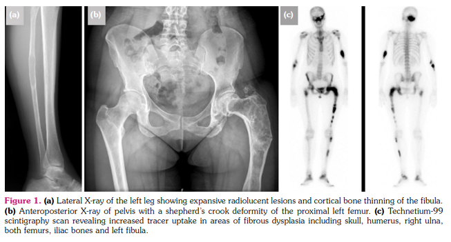 A 36-year-old woman was evaluated for a one-year history of diffuse bone pain. The patient had a history of fractures of the left femur and humerus at pediatric age, after relatively minor traumas, like falls from standing height. On clinical examination, she presented with a left-sided coxa vara and leg length discrepancy. Skin lesions were not evident, and she had no history of precocious puberty. Laboratory findings showed a mild elevation of alkaline phosphatase (155 U/L, normal value <120 U/L) and 25-hydroxy-vitamin D deficiency (9 ng/mL, normal value >30 ng/mL). Other bone-related laboratory tests, including albumin-adjusted serum calcium, phosphate, and parathyroid hormone, and renal profile were normal. Thyroid stimulating hormone and thyroxine had normal values. Osteoarticular X-rays showed multiple expansive radiolucent lesions with a groundglass appearance and thin bone cortex in both femurs, iliac bones, left fibula, humerus, and right ulna (Figure 1a). Pelvis X-ray revealed a heterogeneous, mixed lytic and sclerotic, expansile lesion involving the neck and proximal diaphysis of the left femur, left acetabulum, and ischiopubic ramus. A shepherd’s crook deformity with bowing and varus angulation of the proximal femur was also apparent (Figure 1b). In cranial X-ray, occipital expansive sclerotic lesions were identified. The technetium-99 scintigraphy scan showed increased tracer uptake in multiple locations (Figure 1c). All these findings were compatible with polyostotic FD. The patient was treated with vitamin D supplementation and three cycles of intravenous pamidronate (180 mg, spread over three consecutive days, every six months), which partially relieved symptoms and normalized alkaline phosphatase levels.