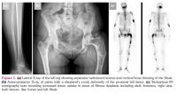 Fibrous dysplasia (FD) is a genetic skeletal disorder caused by α sporadic mutation in the a subunit of the G stimulatory protein, leading to the replacement of normal bone and marrow by poorly organized fibro-osseous tissue.[1] The disease may be localized to a single bone (monostotic FD) or involve multiple bones (polyostotic FD).[2] McCune-Albright and Mazabraud syndromes are two rare forms of the disease, respectively associated with endocrine disorders and intramuscular myxomas.[3] Polyostotic FD most commonly affects the skull, mandible, pelvic bones, and femur.[3] Sometimes severe skeletal deformities can be seen, the most characteristic being the shepherd’s crook deformity.[3]