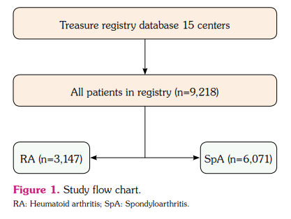 The data collection was started on December 2017 and ended on June 2021. At the time of the analysis, the registry database included 3,147 RA patients (2,502 males, 645 females; median age 56 years; range, 44 to 64 years) and 6,071 SpA patients (2,709 males, 3,362 females; median age 43 years; range, 36 to 52 years). The 1987 American Colleague of Rheumatology (ACR)[7] and 2010 European Alliance of Associations for Rheumatology (EULAR)/ACR classification criteria[8] for the diagnosis of SpA, modified New York criteria,[9] the 2009 EULAR classification criteria for axial SpA[10] and peripheral SpA,[11] Assessment of SpondyloArthritis International Society classification criteria for nonradiological axial SpA,[12] and CASPAR (Classification of Psoriatic Arthritis) criteria[13] were utilized in the TReasure registry. Additionally, peripheral joint involvement or axial involvement for the diagnosis of enteropathic arthritis and Crohn's disease or ulcerative colitis was included in the TReasure registry.