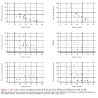 Correlations of age, disease duration, disease activity, dryness severity, pain, emotional state, and insomnia level with fatigue assessed by FACIT-F, FS, and ESSPRI fatigue in PSS patients is shown in Table 3. Age, disease duration, parameters of dryness severity, and PTs were not correlated with FACIT-F, FS, or ESSPRI fatigue scores. However, the ESSDAI score negatively correlated with both the FACIT-F (Rho=-0.304) and the FS score (Rho=-0.345) but not with the ESSPRI fatigue score (Rho=0.034). In addition, the number of painful body sites (NPBS) and PDQ, BDI, BAI, and ISI scores were negatively correlated with the FACIT-F and FS scores and positively correlated with the ESSPRI fatigue score. The scatter plot of correlations of BDI, BAI, ISI, ESSDAI, NPBS, and PDQ scores with the FS is shown in Figure 1. Nineteen of the PSS patients included in the study had hypergammaglobulinemia (plasma globulin/ plasma albumin >25%). In PSS patients with and without hyperglobulinemia, mean FACIT-F scores were found to be 108.0±22.0 and 96.3±25.1 (p=0.100), and mean FS scores were 33.3±11.6 and 29.6±11.0 (p=0.256), respectively.
