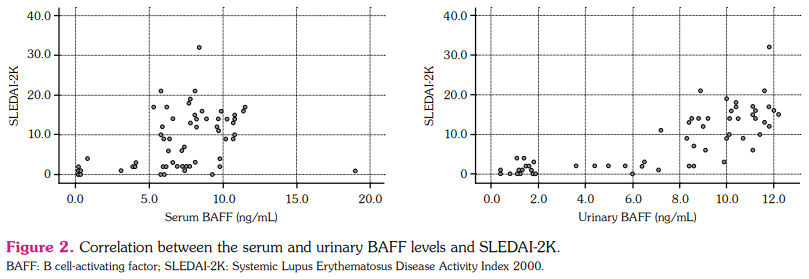 Patients and methods: This case-control study was conducted with 87 participants between December 2020 and September 2021. Sixty-two SLE patients who fulfilled the eligibility criteria were enrolled. SLE patients were categorized into active (n=34) and inactive (n=28) groups based on their Systemic Lupus Erythematosus Disease Activity Index 2000 (SLEDAI-2K) scores. The control group consisted of 25 healthy subjects. Serum and urine samples were collected for the measurement of BAFF levels. Finally, the relationship between these variables and SLE disease activity was investigated.