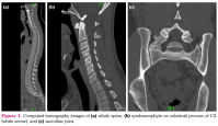 Upon suspicious of ankylosing spondylitis (AS), CT scan for sacroiliac joints and sacroiliac joint, and human leukocyte antigen (HLA)-B27 was tested. The CT scan showed bilateral Grade 2 sacroiliitis which was compatible with AS Figure 1c), and positive result for HLA-B27. The most widely used method for evaluating spinal structural damage, the modified Stoke Ankylosing Spondylitis Spinal Score only includes anterior aspect of C2 lower border to T1 upper border and T12 lower border to sacrum upper border,[1] and novel method using CT of whole spine (CT syndesmophyte score) includes lower border of C2 to upper border of sacrum.[2] These methods do not count the syndesmophyte on odontoid process of C2. The patient showed a rare case of AS which only showed syndesmophyte on odontoid process of C2.
