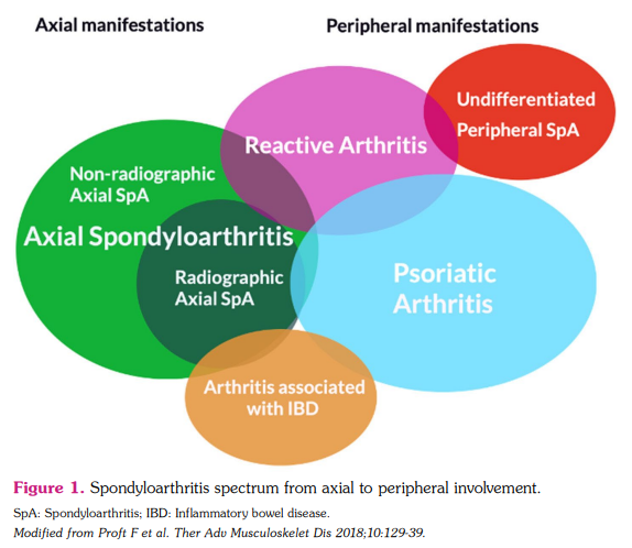 Spondyloarthritis refers to a group of chronic inflammatory diseases that share common clinical features including inflammatory back pain, peripheral arthritis, enthesitis, uveitis, psoriasis, and inflammatory bowel disease (IBD). This disease concept encompasses several interrelated but distinct disorders: axial spondyloarthritis (axSpA), psoriatic arthritis (PsA), reactive arthritis (ReA), IBD-associated arthritis, and undifferentiated spondyloarthritis (Figure 1).[1] They each possess distinct clinical phenotypes and patterns of joint involvement. AxSpA primarily affects the spine and sacroiliac joints (SIJ); PsA manifests mainly as peripheral-often asymmetric-oligoarthritis, axial disease, enthesitis, and dactylitis; ReA classically follows certain infections and presents with lower extremity arthritis and enthesitis; IBD-associated spondyloarthritis occurs in patients with IBDs like Crohn disease and ulcerative colitis.[1]