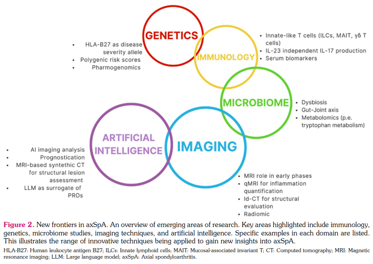 In summary, leveraging new technologies in genetics, immunology, microbiome research, imaging, and artificial intelligence (AI) holds tremendous potential to uncover axSpA disease insights, enable precision diagnosis and treatment, and ultimately improve the lives of patients struggling with this challenging disease. By pursuing a multidisciplinary approach across these exciting fields, researchers can pave the way for the next generation of innovations in axSpA care.[21]