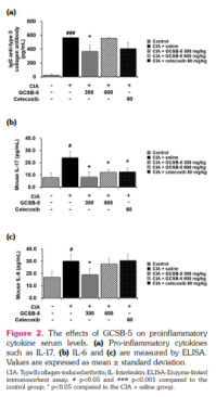 To investigate whether GCSB-5 affected antibody production against type II collagen and proinflammatory cytokine levels in CIA mice, serum levels of anti-type II collagen IgG, IL-17, and IL-6 were measured by ELISA. Administration of GCSB-5 (300 mg/kg) decreased the serum concentration of the anti-type II collagen IgG (Figure 2a). The serum concentrations of IL-17 in GCSB-5-treated groups (both 300 mg/kg and 600 mg/kg) were also lower than those in the saline-treated CIA group (Figure 2b). Both GCSB-5-treated groups showed comparable serum IL-17 levels to the celecoxib-treated group. Serum concentrations of IL-6 were lower in the GCSB-5 (300 mg/kg)-treated group than those in the saline-treated CIA group; however, GCSB-5 (600 mg/kg) treatment did not significantly reduce serum IL-6 levels (Figure 2c). Additionally, IL-6 serum levels were lower in the GCSB-5 (300 mg/kg)-treated group (p< 0.001) and in the GCSB-5 (600 mg/kg)-treated group (p< 0.01) compared to those in the celecoxib-treated group.