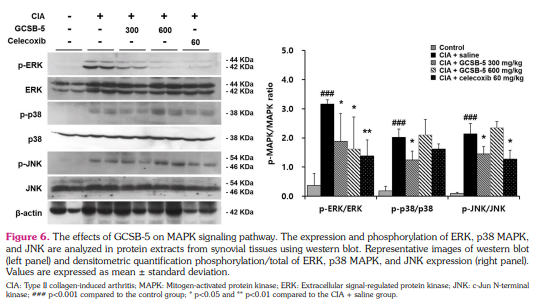 Results: GCSB-5 treatment diminished the severity of clinical arthritis and increased the nociceptive threshold in mice with CIA. Celecoxib, a positive control drug, also showed comparable changes. Clinical arthritis scores were inversely related to mechanical thresholds. GCSB-5 administration decreased the levels of anti-type II collagen antibody and inflammatory cytokines in the sera of mice with CIA. Furthermore, ERK, p38 MAPK, and JNK phosphorylation were downregulated and TRPV1 and ASIC3 expression were decreased in the synovium of GCSB-5-treated mice compared to salinetreated mice. Interleukin-6-induced TRPV1 and ASIC3 upregulation were also inhibited by GCSB-5 in human RA fibroblast-like synoviocytes in vitro.