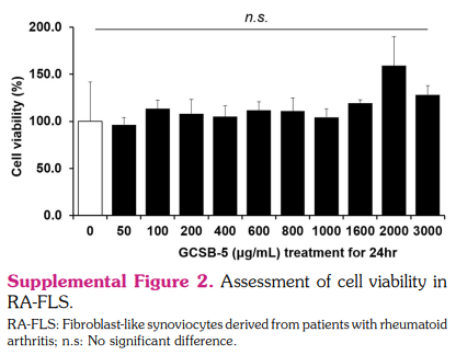 In conclusion, GCSB-5 reduced the severity of inflammatory arthritis by regulating the MAPK signaling pathway in a murine model of RA in this study. GCSB-5 has beneficial effects in relieving pain. Suppressed expression of pain-associated receptors, such as TRPV1 and ASIC3, by GCSB-5 treatment was confirmed both in vivo and in vitro. These results suggest the possibility that GCSB-5 could be an effective anti-inflammatory and pain-relieving agent for autoimmune inflammatory arthritis, including RA.