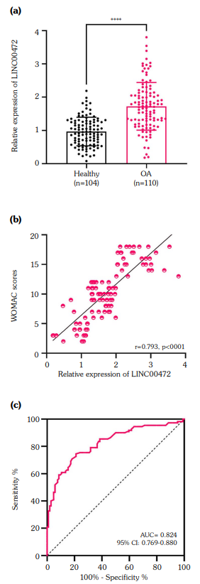 Compared to healthy controls, LINC00472 levels were raised in OA patients (p<0.0001, Figure 1a). LINC00472 levels were positively related to WOMAC scores (p<0.0001, R=0.793, Figure 1b). As shown in Figure 1c, the area under the curve was 0.824, with a sensitivity of 74.55% and specificity of 78.85%, demonstrating that LINC00472 could accurately identify OA from healthy individuals.