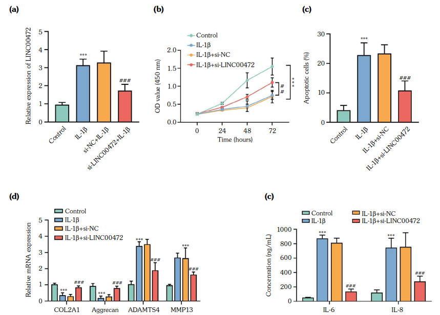 Interleukin-1β could induce the high expression of LINC00472 in chondrocytes, and LINC00472 levels gradually increased with the increase of IL-1β concentration and the prolongation of IL-1β induction time (Figures 2a, b). To investigate the function of LINC00472 in OA, we constructed and used the silenced RNA of LINC00472. As shown in Figure 3a, IL-1β induced the expression of LINC00472 in chondrocytes, and the level of LINC00472 did not change significantly after transfection of chondrocytes with si-NC. However, silencing LINC00472 reduced IL-1β-induced expression of LINC00472, demonstrating that the cell transfer in this study was effective. Furthermore, IL-1β inhibited chondrocyte activity and promoted apoptosis, and silencing LINC00472 partially reversed these effects (Figures 3b, c). Downregulation of LINC00472 increased COL2A1 and aggrecan levels and decreased ADAMTS4 and MMP13 levels in chondrocytes (Figure 3d). In addition, low expression of LINC00472 downregulated levels of inflammatory factors (Figure 3e).