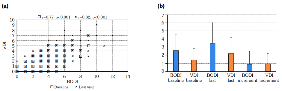 The trend of change of both scores during the follow-up period is shown in Figure 4a. During the follow-up period, 199 (70.6%) patients showed a progressive increment of VDI by ≥1 point as opposed to 99 (35%) patients for BODI (p=0.001).