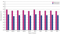The mean temperature in MCP (1-5) and PIP (1-5) joints of both hands was significantly higher in RA patients compared to healthy controls (p<0.05). The mean temperature values of MCP and PIP joints for the right and left hand are represented Figures 1 and 2. The mean temperature values of the joints in the RA patients with RAI score of 0, 1, 2, 3 were 32.43±1.59°C; 32.71±1.36°C; 33.12±1.23°C; 33.60±0.99°C, respectively. The mean temperature was 31.14±1.50°C in healthy controls. The mean temperature values of the joints in the RA patients with RAI score of 0 had high temperature compared to healthy controls (p<0.05). Patients with a Ritchie sensitivity score of 1 had a higher mean temperature compared to patients with 0 (p<0.05). In RA patients, the joints with RAI score of 1 had higher mean temperature values than the joints with RAI score 0 (p<0.05). The mean temperature values of the joints with RAI score of 2 were also higher than the joints with RAI score 1 (p<0.05). The mean temperature values of the joints with RAI score of 3 were also higher than the joints with RAI score 2; however, there was no statistically significant difference (p>0.05).